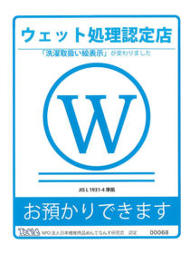 GINYOSHAは、TeMA(日本繊維商品めんてなんす研究会)から「ウエット表示試験工場」に認定されています。商品を試験洗浄して、どのウエット表示が適当かを判断するお手伝いをすることが可能です。詳しくは店舗へお問い合わせください。