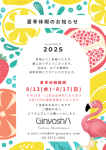 アトリエの方は8月9日(土)~8月17日(日)まで夏期休暇に なりますのでお仕上がりのお日にちなどご注意ください。